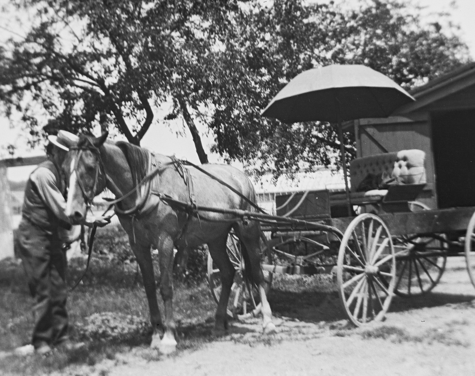 These first two photos (above and below) seem to be the same wagon, but is it the same horse? This house is Richard DeKorn’s house, so I am going to guess it was his wagon and horse. The wagon looks fairly comfy with the upholstered seat and the umbrella.