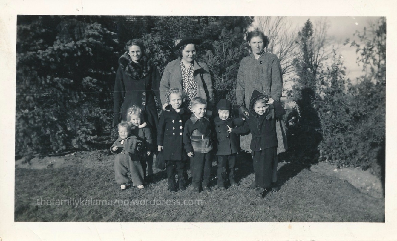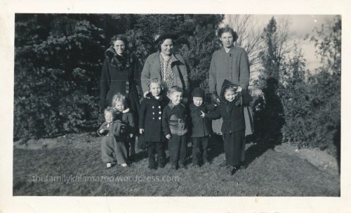 I am digitizing some photographs for my mother, and I found this picture that I just love. It’s my mother’s mother (in the middle) with her two sisters. They are standing with their children–the ones who were born at this point. By the age of the children here, I would say that the picture was taken around 1939-40. What is a little confusing is that nobody looks pregnant and two of them should have been pregnant around that time, unless there are tiny babies asleep just outside the boundaries of the pic!