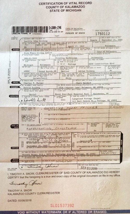 Deaths in the Family: Women’s History Edition » Lucille Edna Zuidweg death certificate