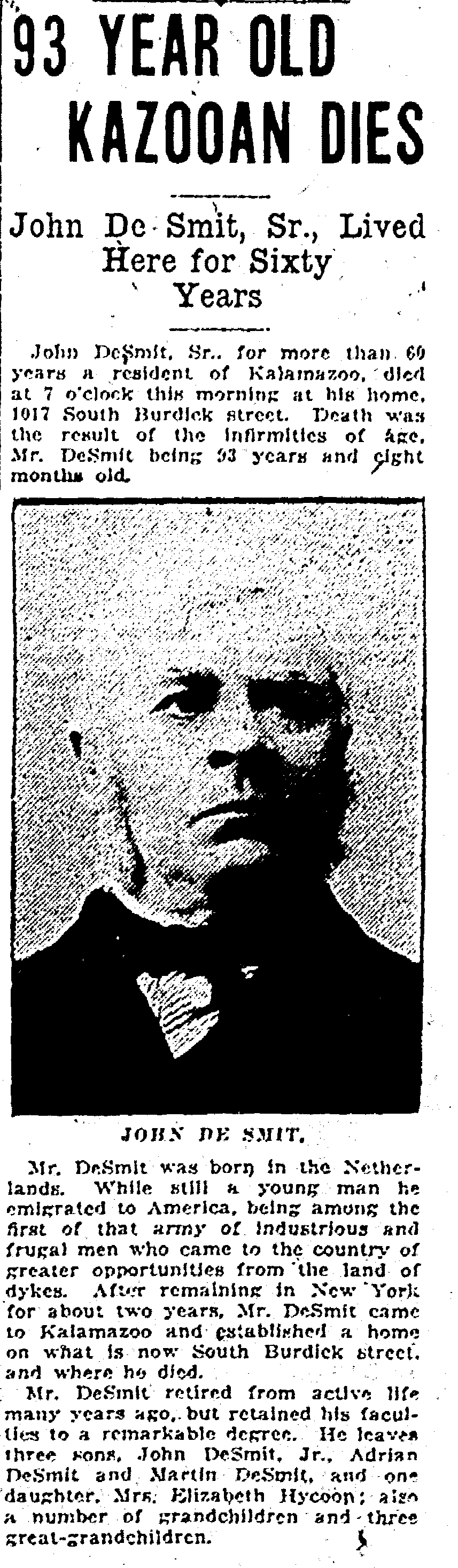 Patriarch of the DeSmits: A Pioneer of Kalamazoo » Kalamazoo_Gazette_1919-03-10_1