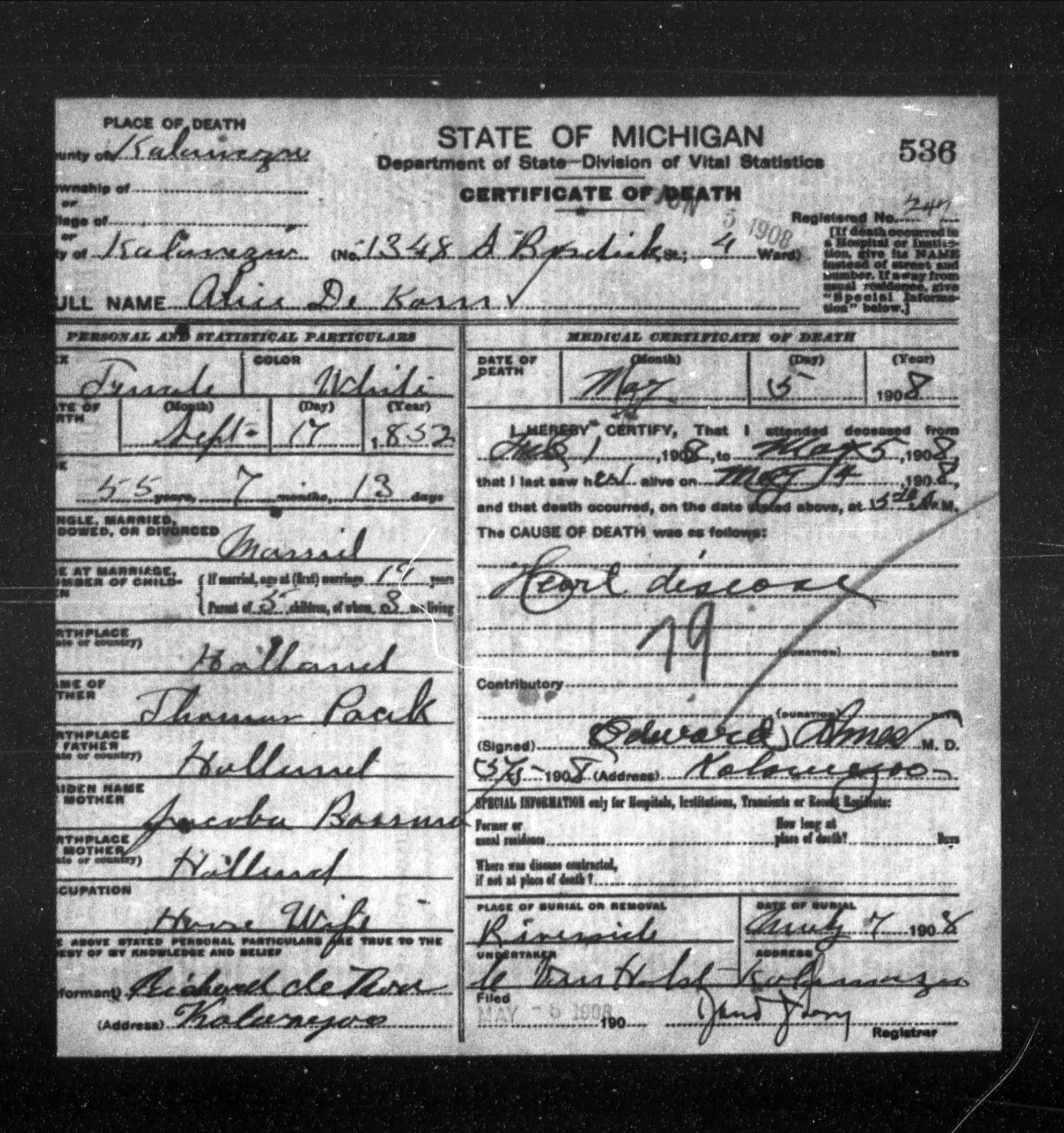 HERE IS THE SECOND UPDATE: Sue Haadsma-Svensson found Jacob’s death ceritificate for me. Look at it carefully: does it look like his address was “Amsterdam Avenue”? If so, there is an Amsterdam Street in Kalamazoo, and it looks like they used to use “Avenue” more often than they do today–or perhaps it was used more informally.
