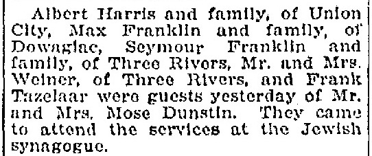 Was Frank the only non-Jew in this party to attend synagogue services? And who was Mose Dunstin and how did Frank know him? All I have learned so far (of value to me for my curiosity) about Mose was that he was Moses Dunstin, born in “Russian Poland,” and his father’s surname was Danskin. He died 4 April 1910 in Kalamazoo at the age of 52. Cause of death was Angina Pectoris (chest pain) and contributing factors were influenza and albuminaria. Notice that for Moses I was able to get a free death certificate. So unfair . . . . Anyway, when Moses invited Frank to attend services, Moses was only 48.