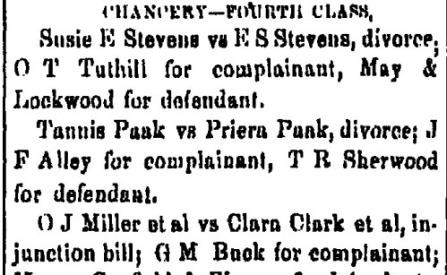 Tannis Paak vs Priera Paak, divorce; J F Alley for complainant, T R Sherwood for defendant. I don’t know what “Chancery–Fourth Class” means to this case, but it looks to me as if Teunis was the one to file for divorce. This makes him the first direct ancestor I have ever found who went through a divorce.