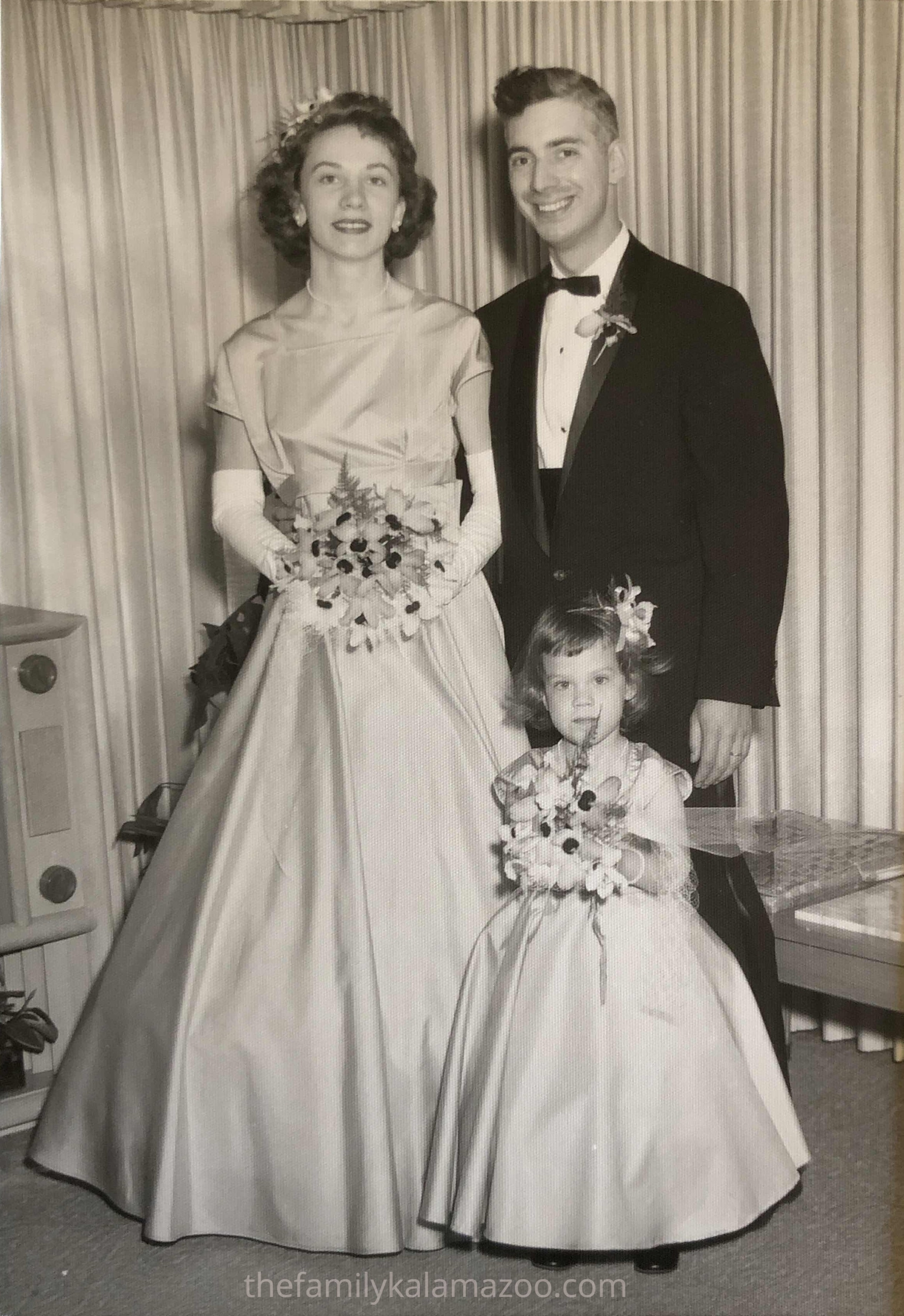 I’ll leave you with one last photo. Groomsman (my father), bridesmaid (my mother), and the flower girl (me), only 2 3/4 years old. Our dresses were blue. My most enduring memory of that wedding is the interminable time we spent waiting through the ceremony for them to get hitched. There was a full mass, and I was supposed to be kneeling the whole time with the bridesmaids. Aunt Dolly’s mother wasn’t too happy that I was so antsy and didn’t want to kneel. The photo was taken before the wedding, but that expression on my face is as if I knew what I was in for.