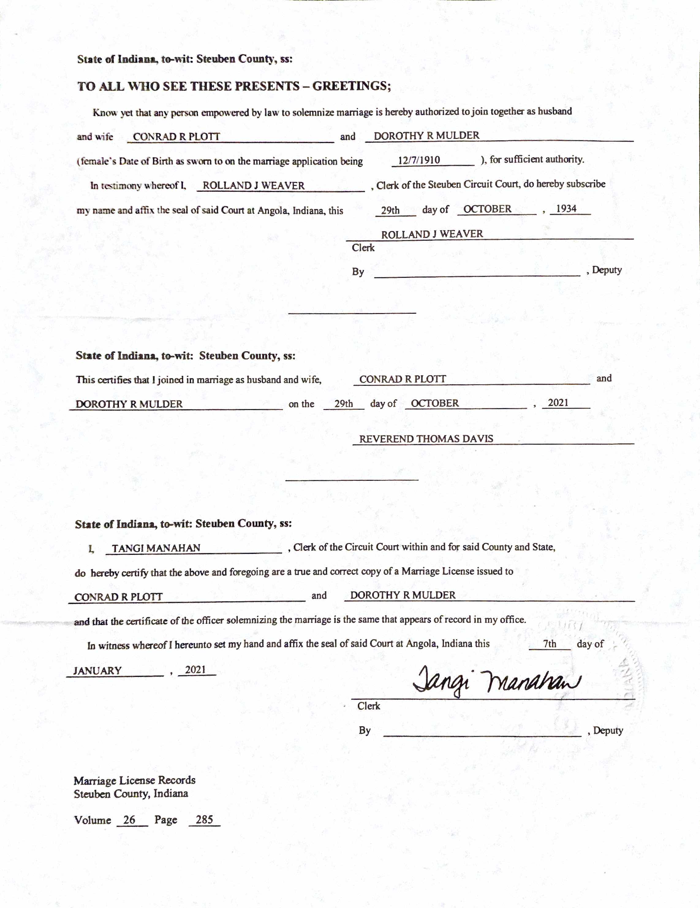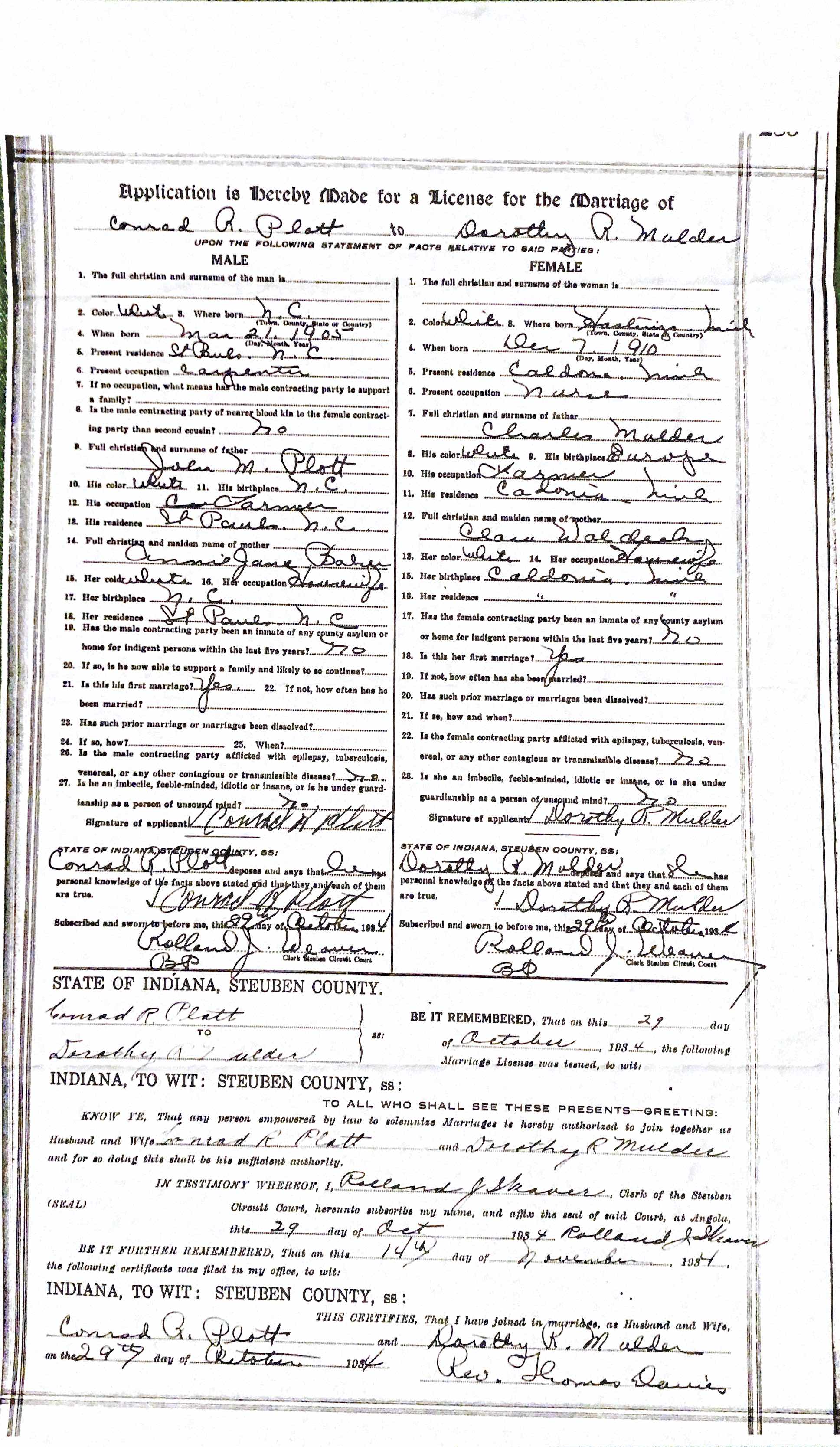 Pete and Ruby (born 6 February, 1920) were married on 10 August 1940, when Pete was 24 and Ruby was 20. Here is their marriage record. They were married, as were Vena and Al, by Pete’s cousin, Ed Waldeck.