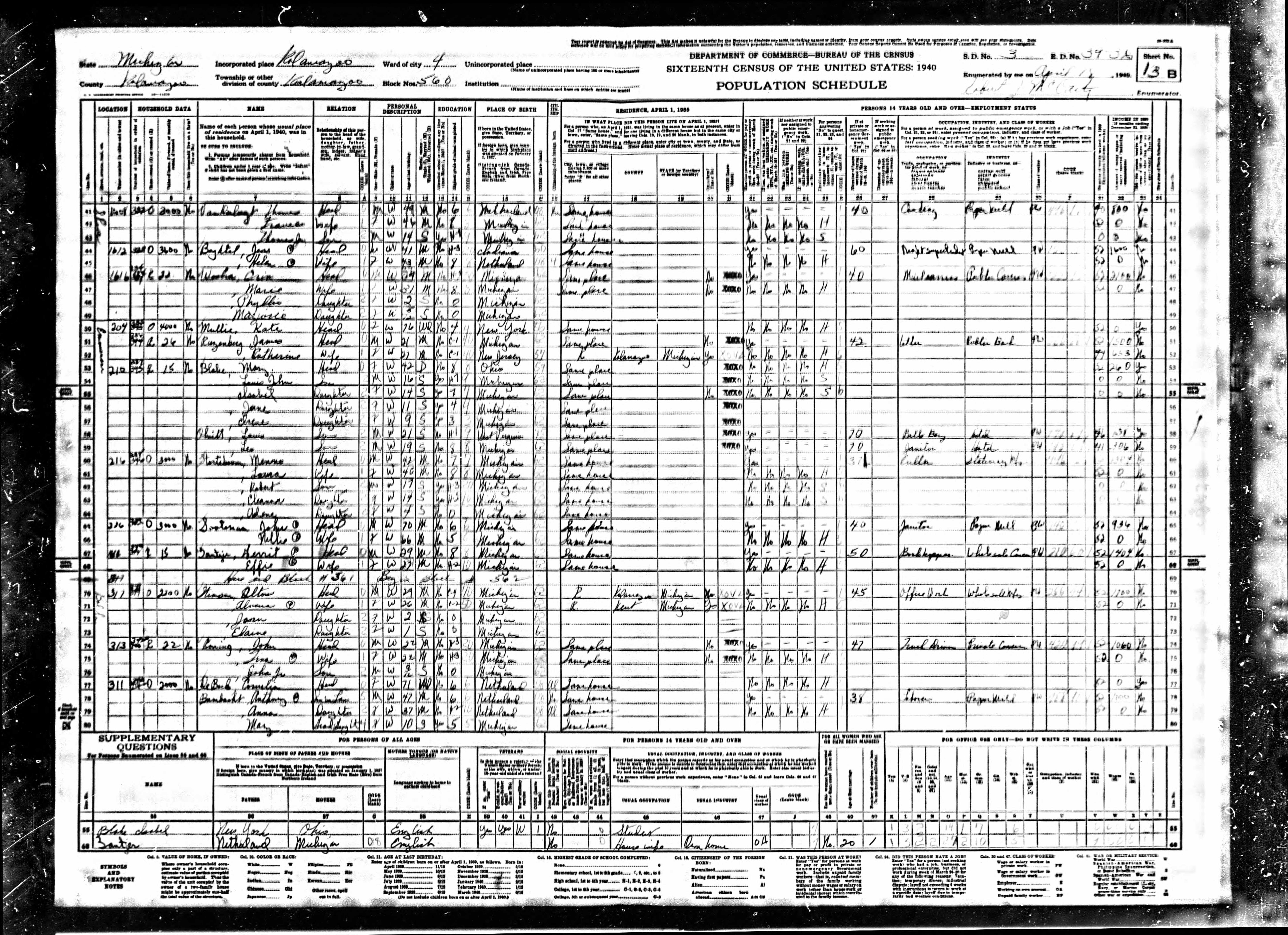 Also according to the 1940 census, Chuck’s fellow boarder was his brother Peter Mulder and their first cousin, Herbert Waldeck. I don’t recognize the names of the other boarders, although several of them are the same age range as Chuck, Pete, and Herb. Lines 21, 22, and 24: