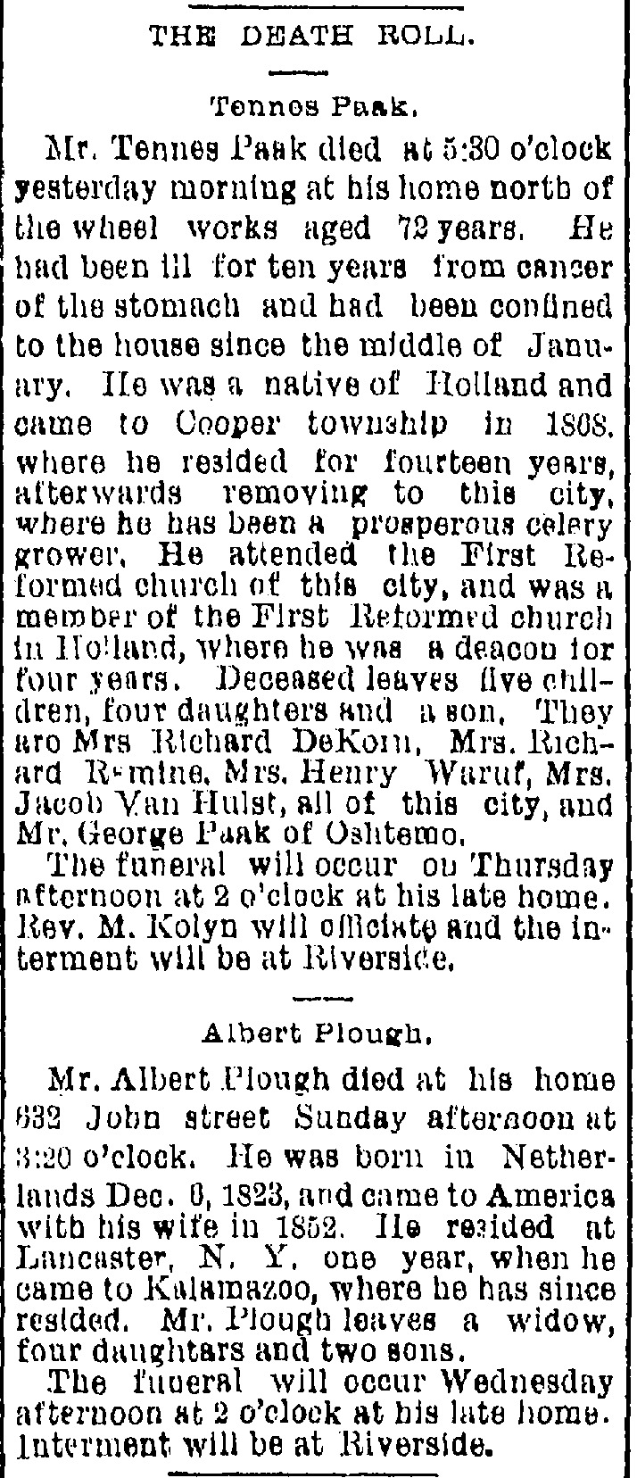 My great-great grandmother Alice Paak DeKorn, born 1852, was the oldest daughter, second oldest child. The third child was Anna Catherina or Annie, born 6 January 1855 in Lexmond, Zuid-Holland, Netherlands. In 1865, their mother Jacoba Bassa Paak passed away. Three years later the family immigrated to the United States. They lived for some time in Cooper, then moved to Kalamazoo.