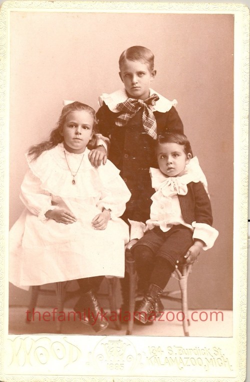 This is Gertrude, Richard, and Adrian DeSmit, the children of John DeSmit and Mary DeKorn DeSmit. Gertrude was born in 1889, Richard 1887, and Adrian in 1891. If we assume that the children are about 6, 8, and 4 in this photo, the year it was taken would be 1895. The photographer Wood was Thomas E. Wood (also went by T.E. Wood) who was in business at least from 1887 to 1895, according to Bushwacking. She says he was not in the city directory in 1899. From 1887-88 he was at 316 E. Main St. From 1889-1895, he was at 134 S. Burdick St. The address on this photo is 134 S. Burdick St. (way up the street from the neighborhood where my relatives lived).