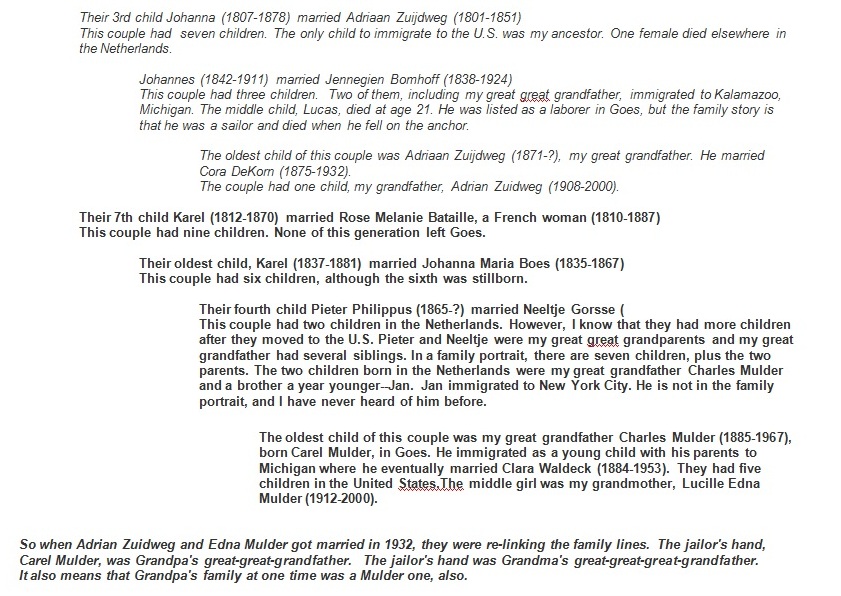 The following are the descendents of Johannes Mulder (and therefore his father, Carel, the jailor’s hand) who have lived in the United States. If there is too much begetting here for you, skip to the end for my followup comments. My Comments.