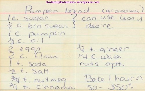 Here is Grandma’s recipe for Pumpkin Bread, which I am sharing through the old recipe card I wrote myself. Bake 1 hour or 50 means an hour or 50 minutes, but don’t get mad at my lack of clarity if you mess it up ;).