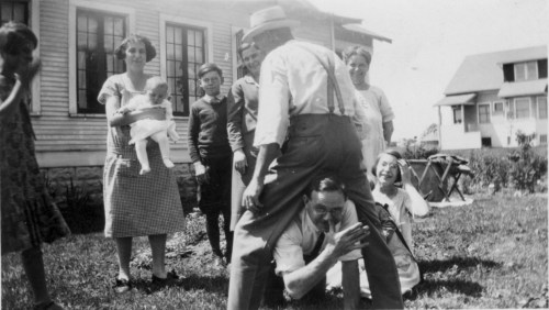 This photo was probably taken at the same time. Seated, holding the little boys, are Helen, my grandmother’s youngest sister, and an unidentified woman, probably a friend or neighbor. Anna is most likely taking the photo. Nobody looks very happy in this one!