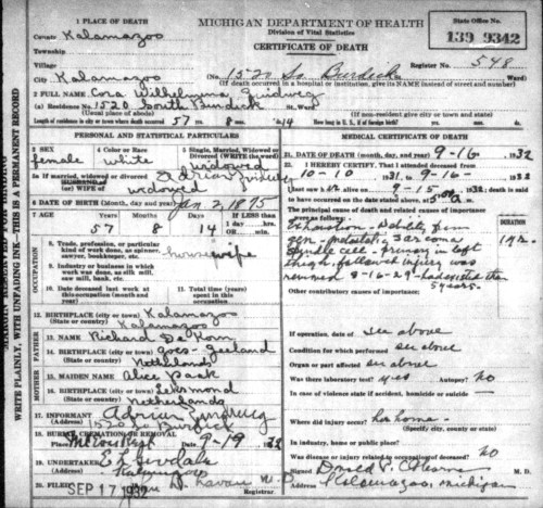 Cora DeKorn Zuidweg died at age 57 on 16 September 1932 in Kalamazoo, Michigan. I have posted about this one in the past.