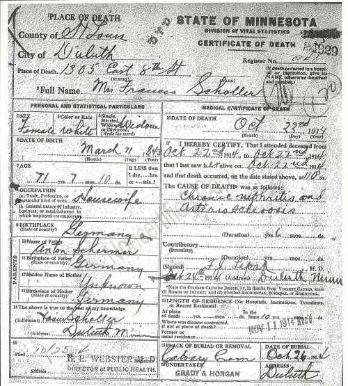Francoise Schirmer (Schermer) Scholler died 22 October 1914 in Duluth, Minnesota.