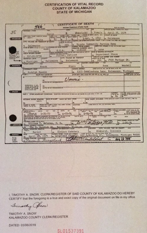 I didn’t have Marie’s death certificate either, so I had to order it from Kalamazoo County.