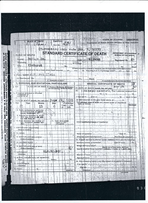 She died of a diabetic coma and also had nephritis and myocarditis. Her health had obviously been poor, although she was only 62–the age I am now. She had also already lost two of her five children, so she had been through a lot. When Margarethe died, her body lay in a casket in their house in Elmhurst. My father told me that there was a thunderstorm during the time it was there, and that the grandchildren were terrified at the combination of events and hid under the huge picnic table style dining room table. She was buried on May 27, but it looks like (from historical rainfall records) the storm most likely occurred the day after her death, on May 25.