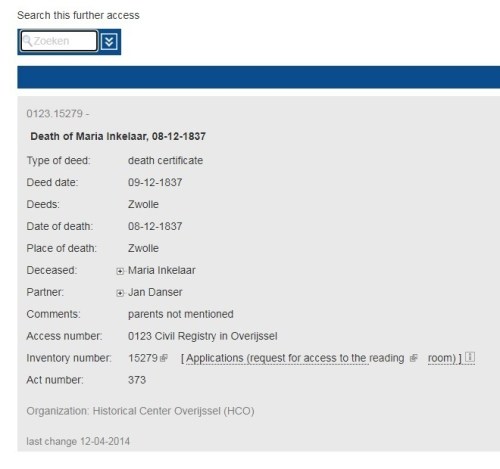 She got these facts from the marriage record of their daughter Jeuntien Dansser to Lukas Bomhof: “Zwolle, Overijssel, the Netherlands, marriage record, 1825, 75, Lucas Bomhof-Jeuntjen Dansser, 13 October 1825; digital images, Familysearch (https://familysearch.org/pal:/MM9.3.1/TH-1-11514-26006-7?cc=1831469&wc=10704172 : accessed 23 December 2012)”